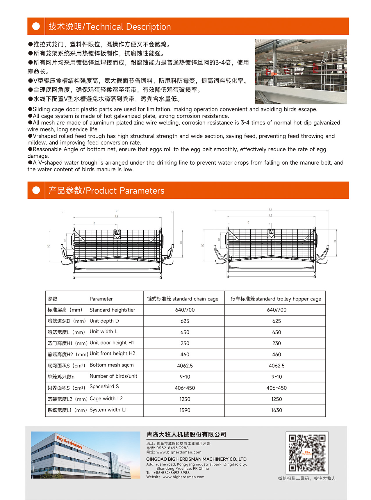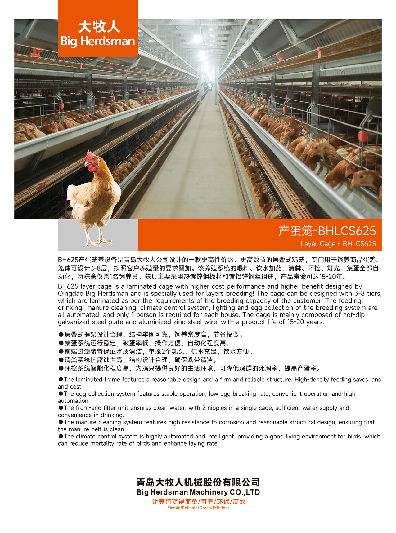 BH625產(chǎn)蛋籠養(yǎng)設(shè)備是青島大牧人公司設(shè)計的一款更高性價比、更高效益的層疊式雞籠,專門用于飼養(yǎng)商品蛋雞,籠體可設(shè)計3-8層,按照客戶養(yǎng)殖量的要求疊加。該養(yǎng)殖系統(tǒng)的喂料、飲水加藥、清糞、環(huán)控、燈光、集蛋全部自動化,每棟舍僅需1名飼養(yǎng)員。籠具主要采用熱鍍鋅鋼板材和鍍鋁鋅鋼絲組成,產(chǎn)品壽命可達15-20年。