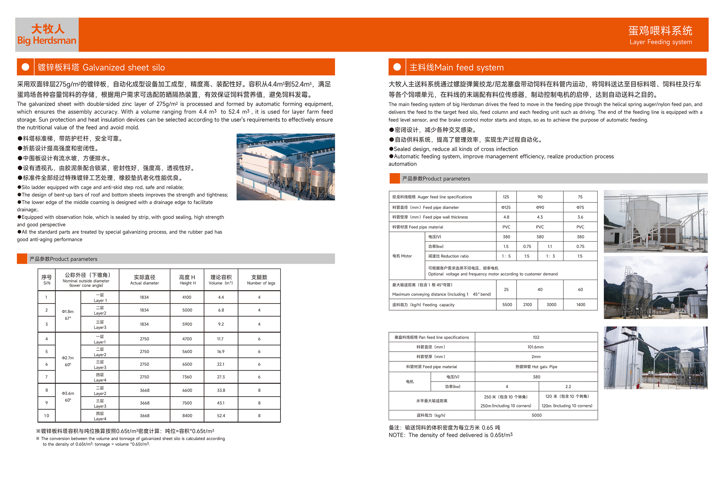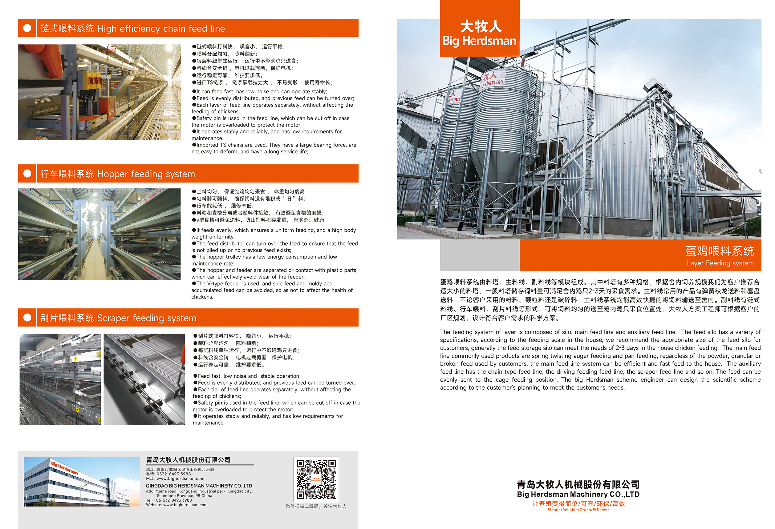 蛋雞喂料系統(tǒng)由料塔、主料線、副料線等模塊組成。其中料塔有多種規(guī)格,根據(jù)舍內(nèi)飼養(yǎng)規(guī)模我們?yōu)榭蛻敉扑]合適大小的料塔,一般料塔儲存飼料量可滿足舍內(nèi)雞只2-3天的采食需求。主料線常用的產(chǎn)品有彈簧絞龍送料和塞盤送料,不論客戶采用的粉料、顆粒料還是破碎料,主料線系統(tǒng)均能高效快捷的將飼料輸送至舍內(nèi)。副料線有鏈?zhǔn)搅暇€、行車喂料、刮片料線等形式,可將飼料均勻的送至籠內(nèi)雞只采食位置處,大牧人方案工程師可根據(jù)客戶的廠區(qū)規(guī)劃,設(shè)計符合客戶需求的科學(xué)方案。