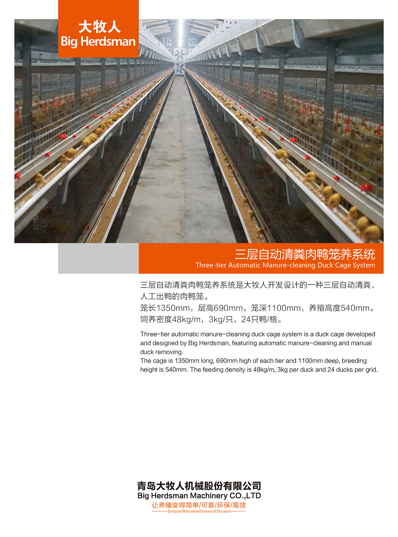 三層自動清糞肉鴨籠養(yǎng)系統(tǒng)是大牧人開發(fā)設(shè)計的一種三層自動清糞、人工出鴨的肉鴨籠。