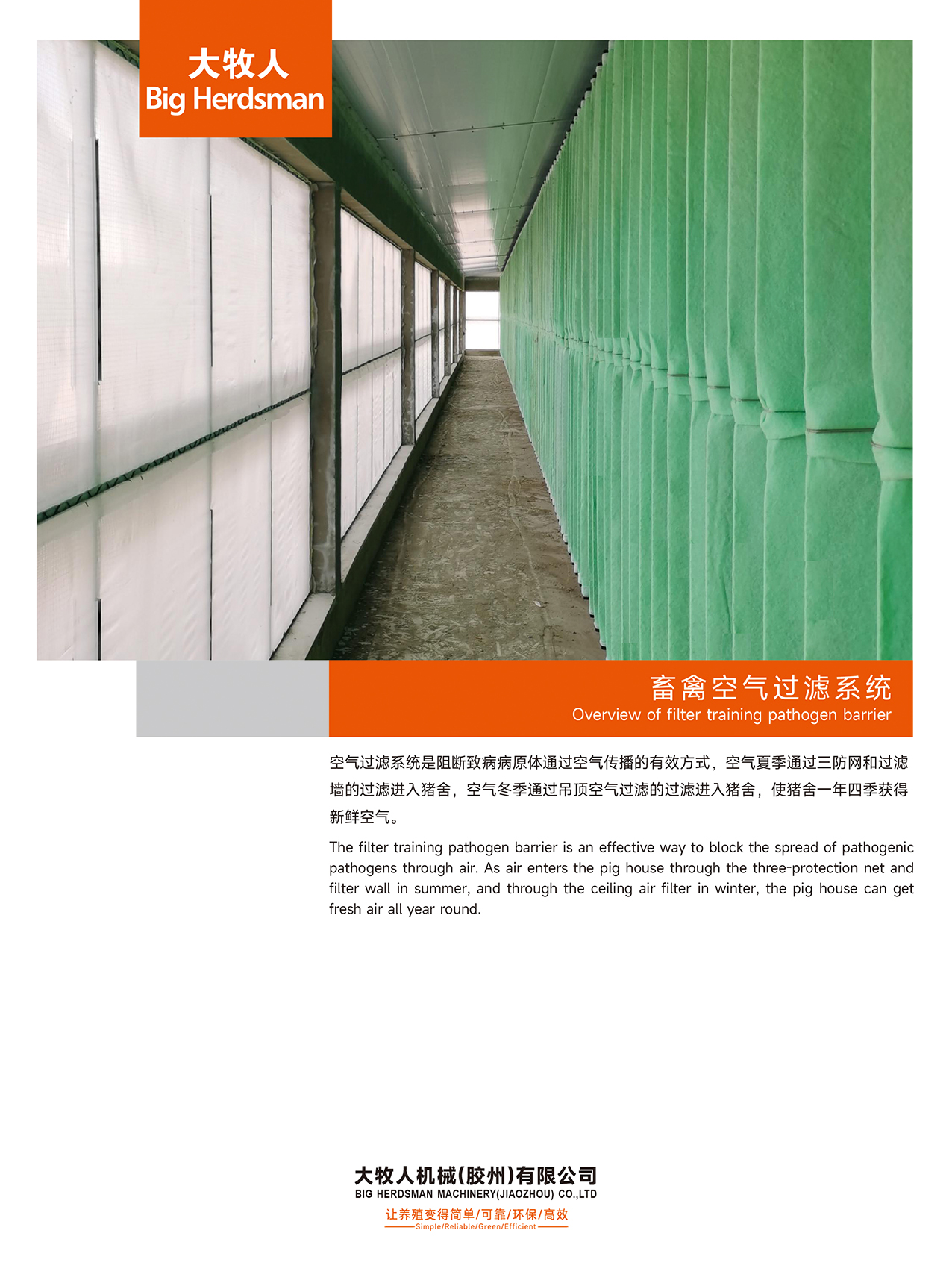 空氣過(guò)濾系統(tǒng)是阻斷致病病原體通過(guò)空氣傳播的有效方式,空氣夏季通過(guò)三防網(wǎng)和過(guò)濾墻的過(guò)濾進(jìn)入豬舍,空氣冬季通過(guò)吊頂空氣過(guò)濾的過(guò)濾進(jìn)入豬舍,使豬舍一年四季獲得新鮮空氣。