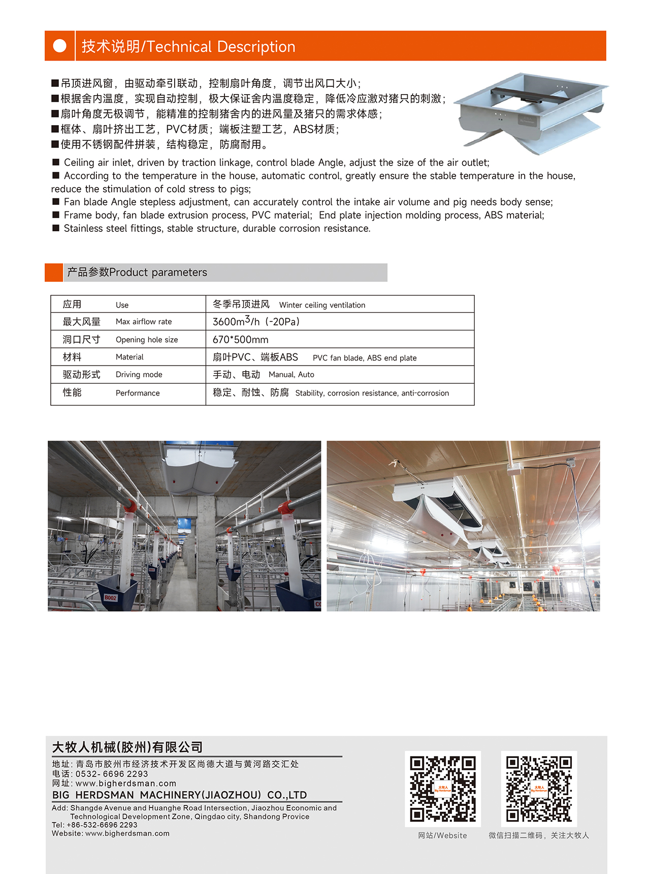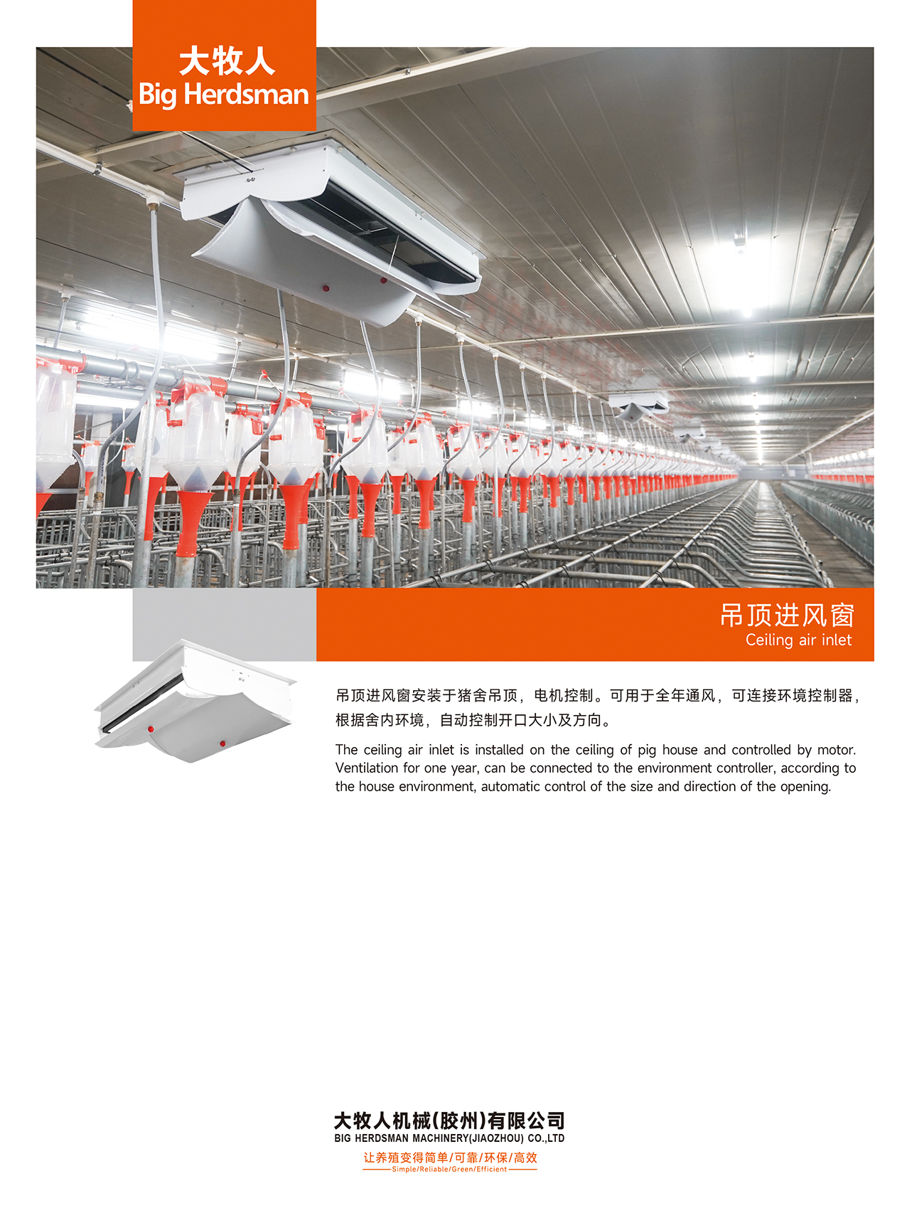 吊頂進(jìn)風(fēng)窗安裝于豬舍吊頂,電機(jī)控制??捎糜谌晖L(fēng),可連接環(huán)境控制器,根據(jù)舍內(nèi)環(huán)境,自動(dòng)控制開口大小及方向。