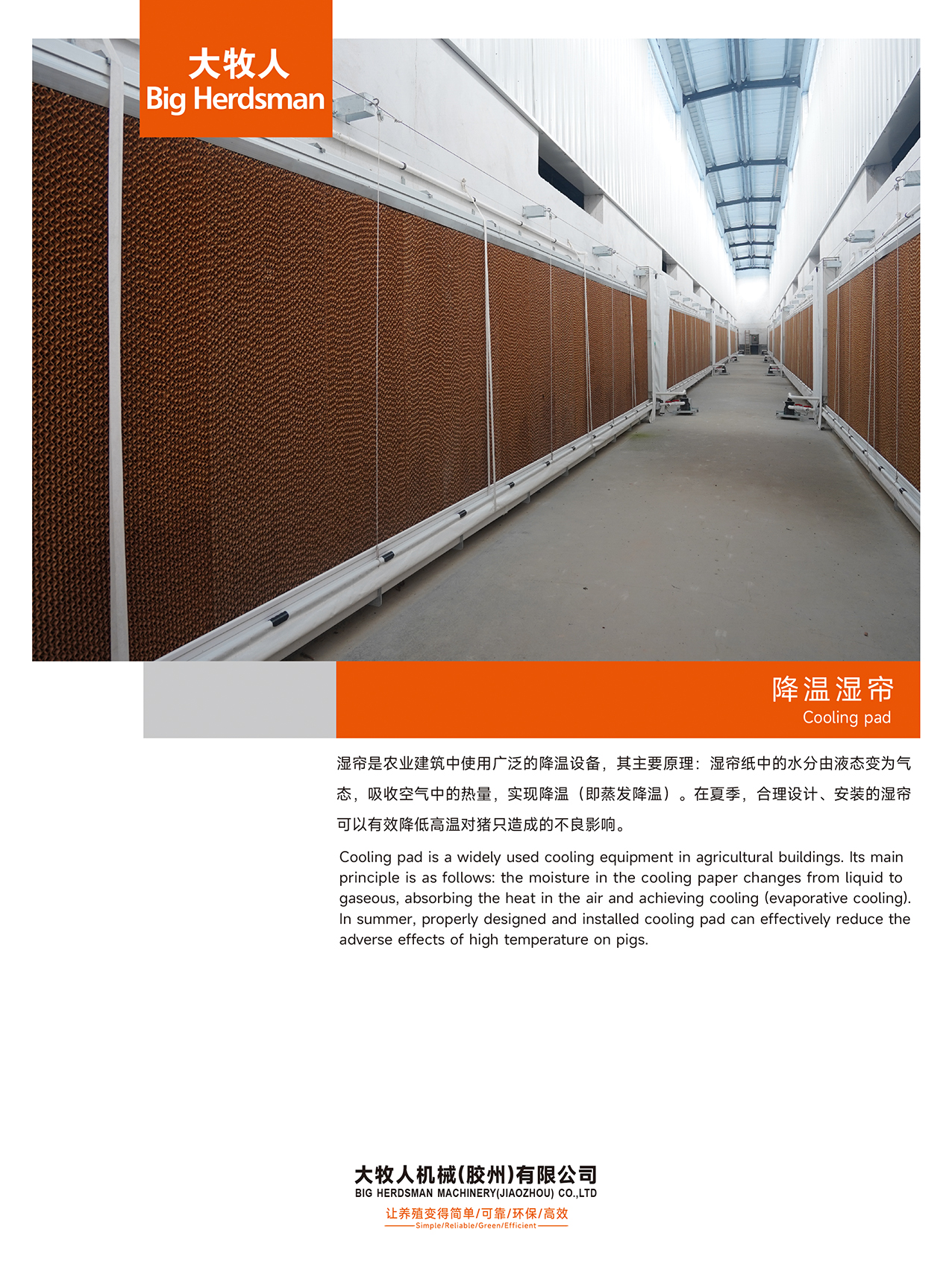 濕簾是農(nóng)業(yè)建筑中使用廣泛的降溫設備,其主要原理:濕簾紙中的水分由液態(tài)變?yōu)闅鈶B(tài),吸收空氣中的熱量,實現(xiàn)降溫(即蒸發(fā)降溫)。在夏季,合理設計、安裝的濕簾可以有效降低高溫對豬只造成的不良影響。