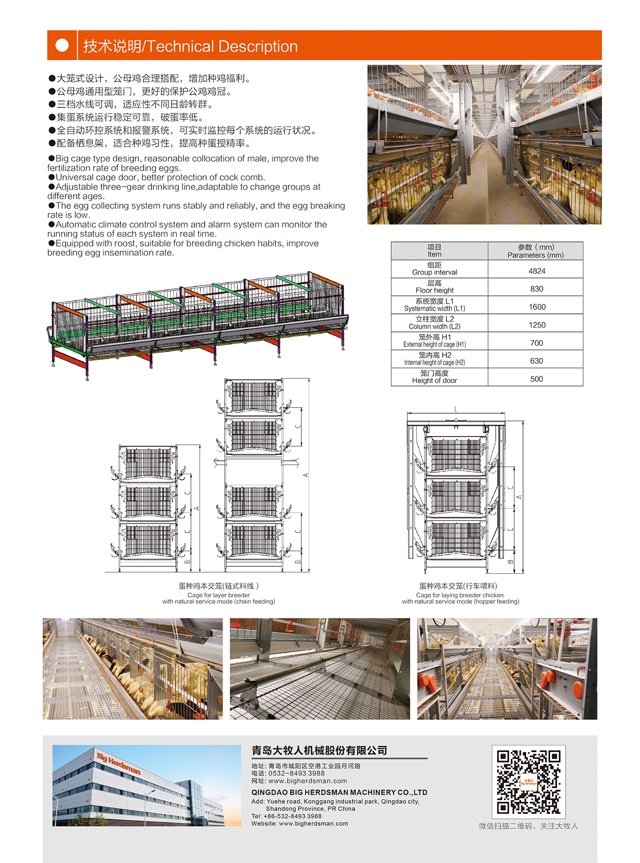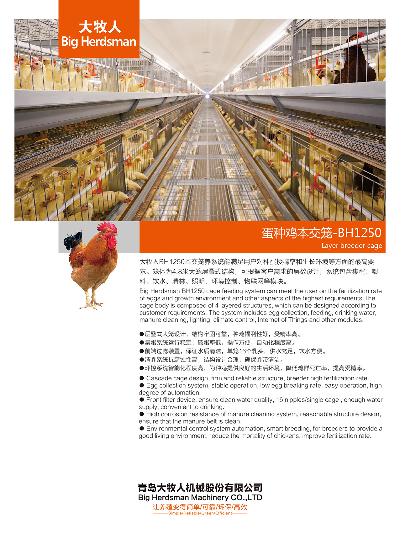 大牧人BH1250本交籠養(yǎng)系統(tǒng)能滿足用戶對(duì)種蛋授精率和生長(zhǎng)環(huán)境等方面的最高要求?;\體為4.8米大籠層疊式結(jié)構(gòu),可根據(jù)客戶需求的層數(shù)設(shè)計(jì),系統(tǒng)包含集蛋、喂料、飲水、清糞、照明、環(huán)境控制、物聯(lián)網(wǎng)等模塊。